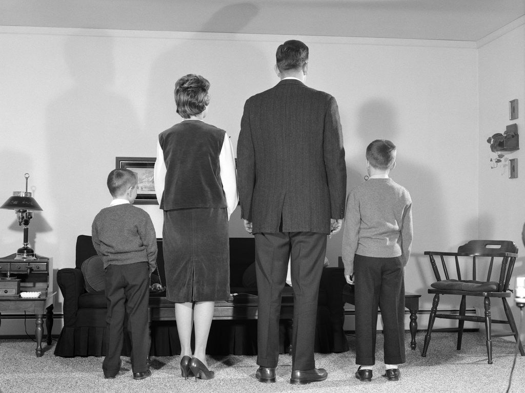 Product images of 1960s Back View Family Of Four Standing In Living Room Mother Father Two Boys
