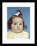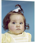 Product details 1960s brunette baby girl ribbon topknot yellow shirt chubby cheeks round face sad unhappy facial expression looking at camera