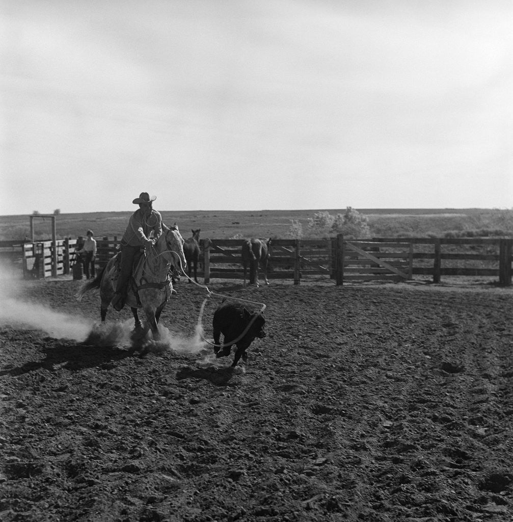 1960s cowboy rodeo rider competitor on horse chasing calf roping event skill sport