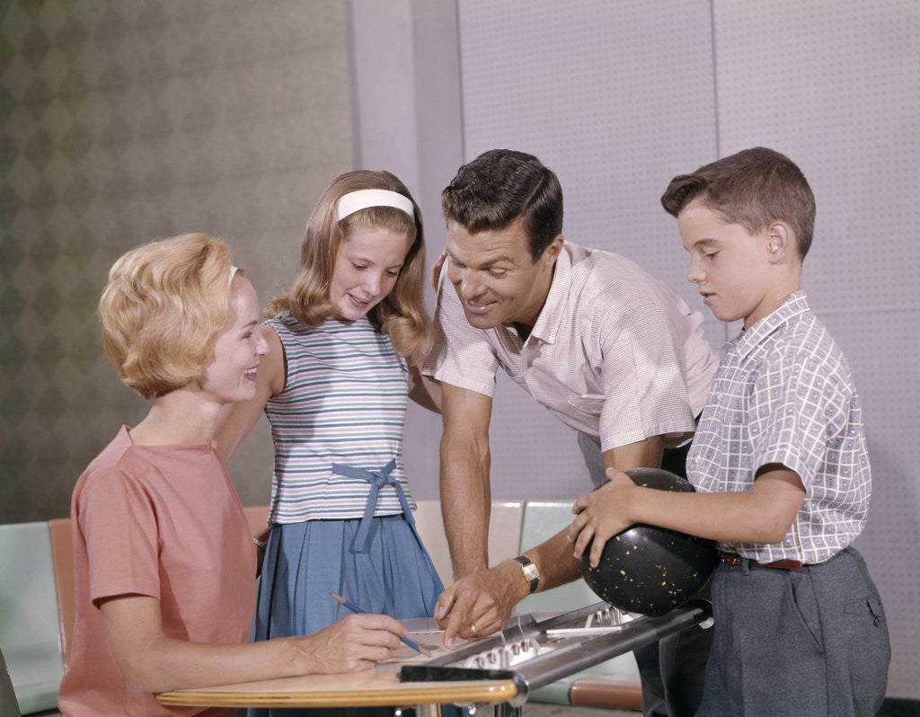 1960s Family Mother Father Daughter Son Together Bowling Looking At Score