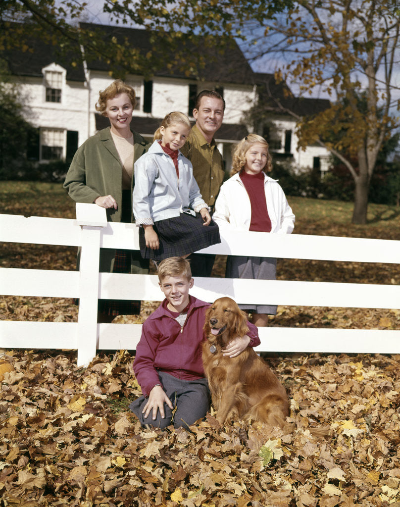 Product images of 1960s Family with Dog At White Board Fence In Front Of Colonial Style Suburban House