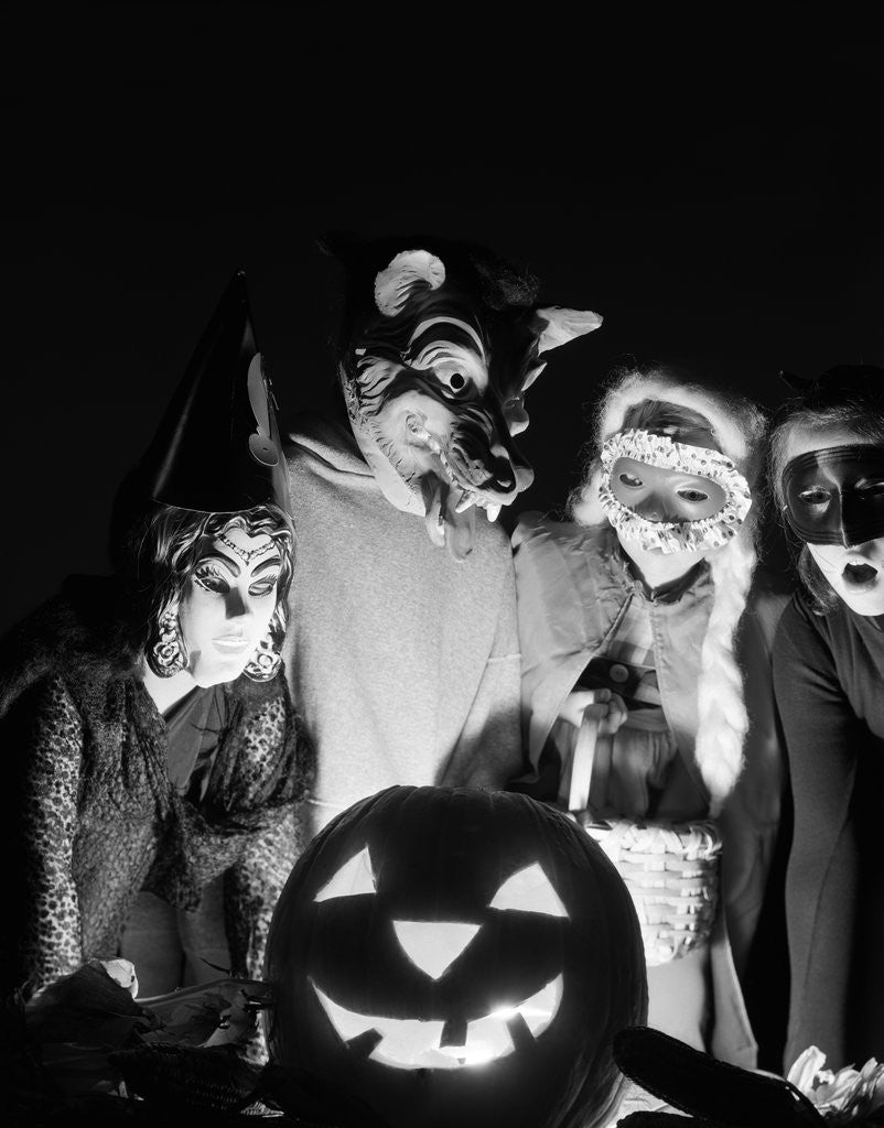 Product details 1960s group of four children in halloween costumes gathered around jack-o'-lantern indoor