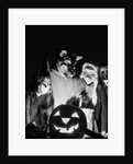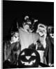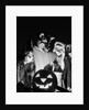 Product images of 1960s group of four children in halloween costumes gathered around jack-o'-lantern indoor