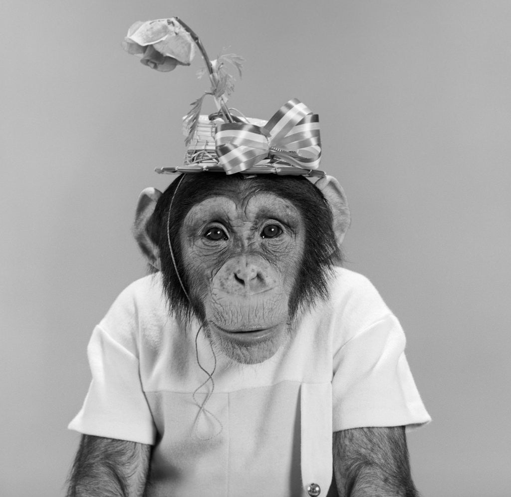 1960s portrait monkey chimpanzee wearing stupid funny hat with bow and flower looking at camera