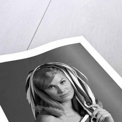 Product images of 1960s portrait woman wrapped in striped sheet with seductive expression on face looking at camera