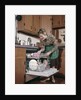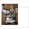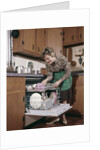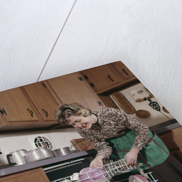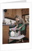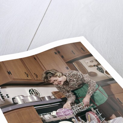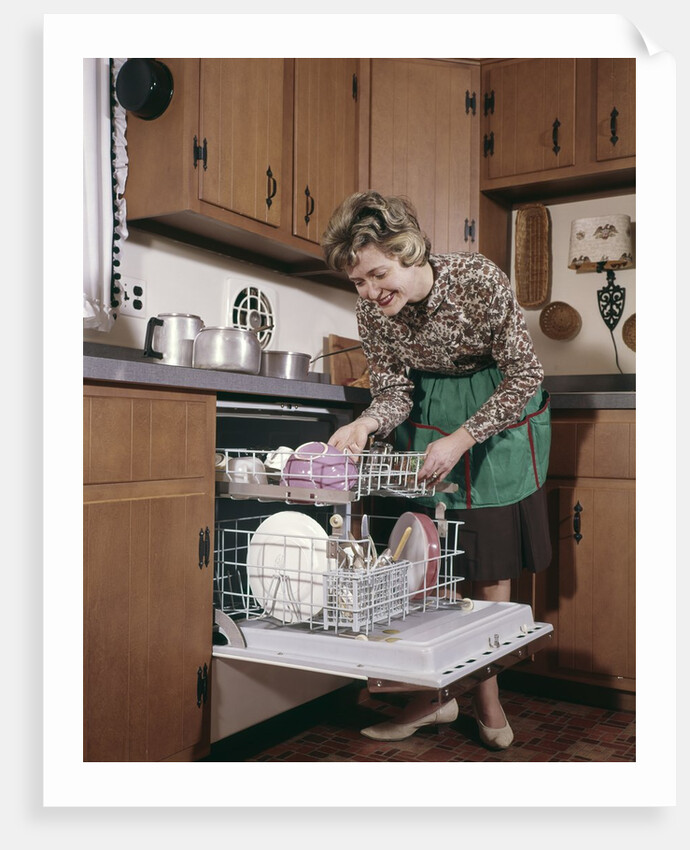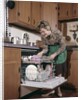 Product details 1960s Smiling Woman Apron Bending Over Emptying Dishwasher In Kitchen