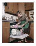Product images of 1960s Smiling Woman Apron Bending Over Emptying Dishwasher In Kitchen