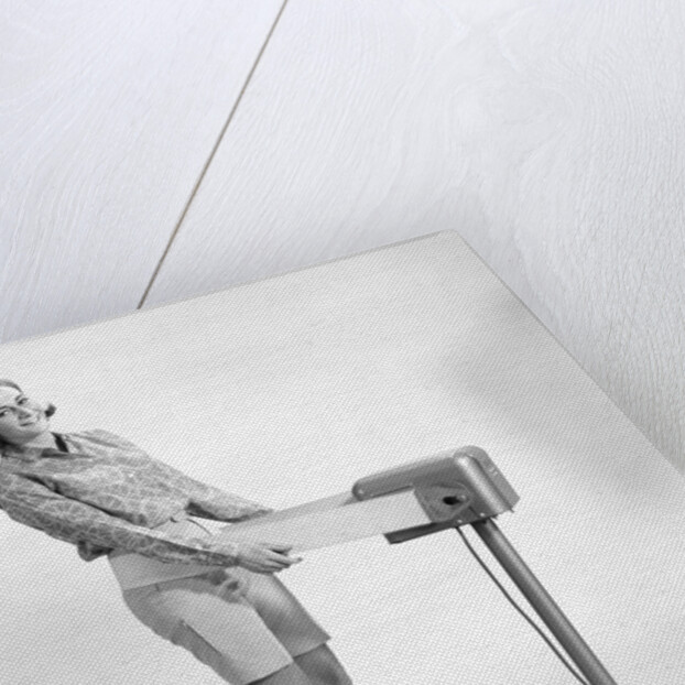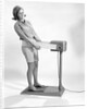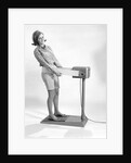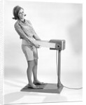 Product images of 1960s smiling young woman standing on weight reducing vibrating exercise machine looking at camera