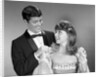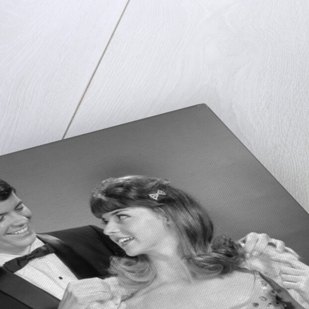 Product images of 1960s teen couple formally dressed boy helping girl on with coat to go to prom
