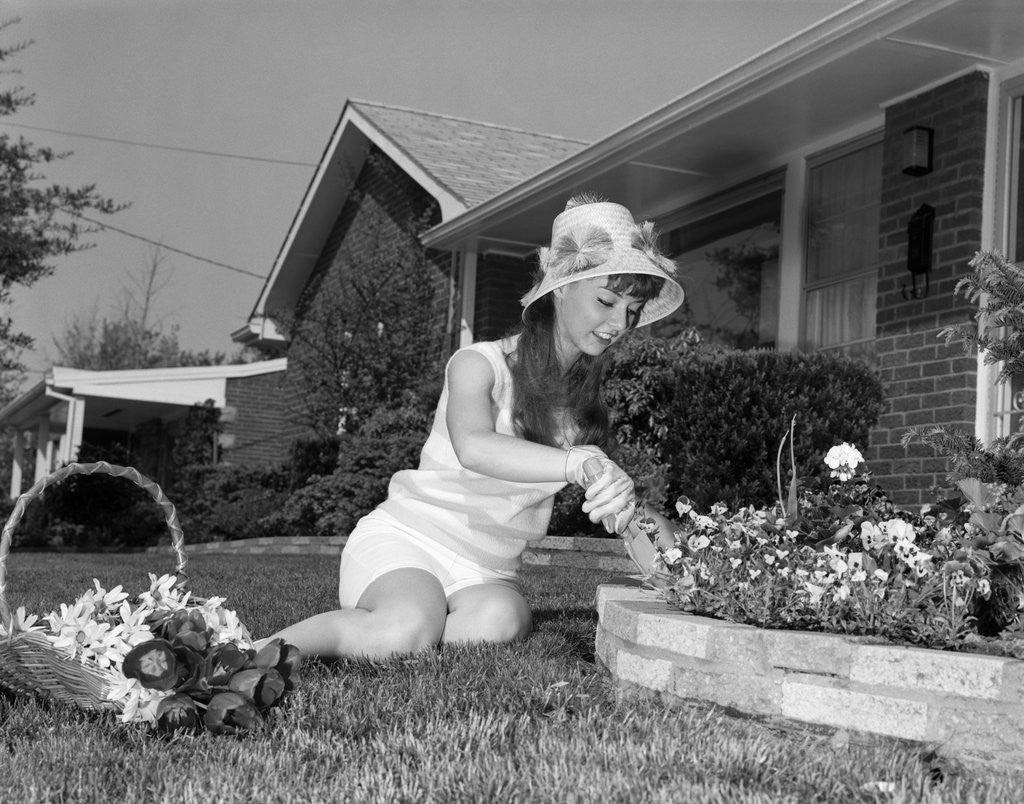 Product images of 1960s young woman gardening in front lawn of brick house