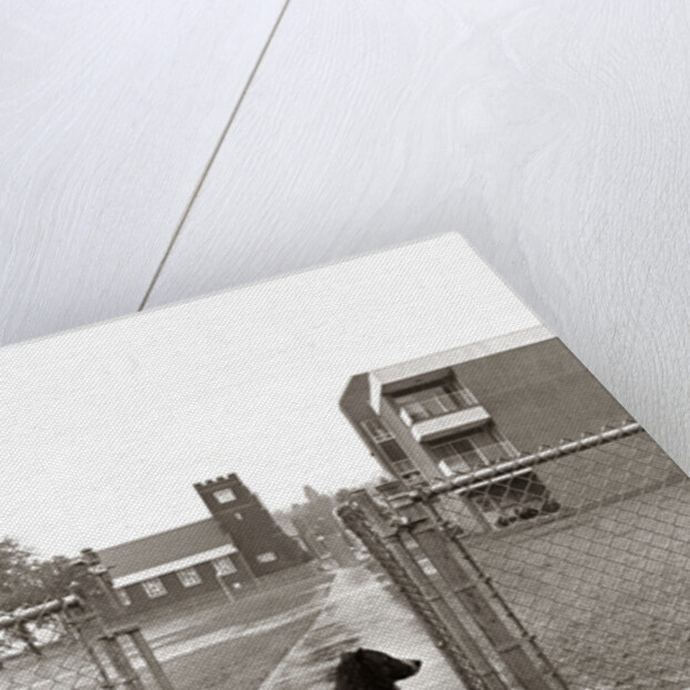 Product details 1970s Black White Spotted Dog Sitting In Rain Waiting By School Yard Gate For His Owner