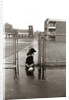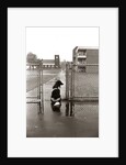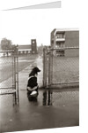 1970s Black White Spotted Dog Sitting In Rain Waiting By School Yard Gate For His Owner