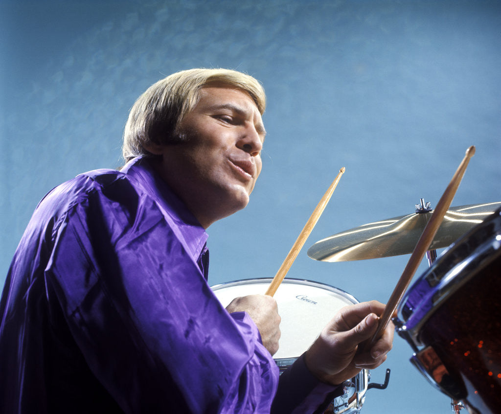 Product images of 1970s musician blond man playing drums wearing purple shirt