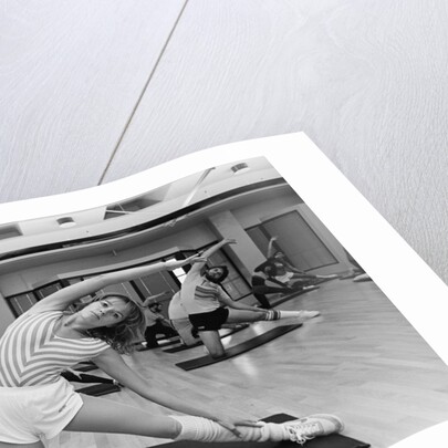 Product images of 1980s aerobics class each person on an individual mat stretching looking at camera