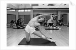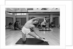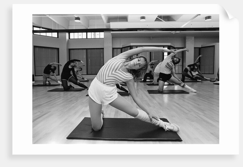 Product details 1980s aerobics class each person on an individual mat stretching looking at camera