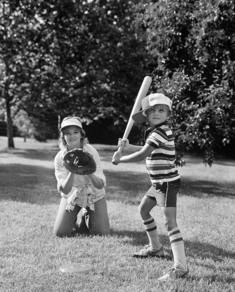 Product details 1980s boy at bat with mother kneeling behind him as catcher