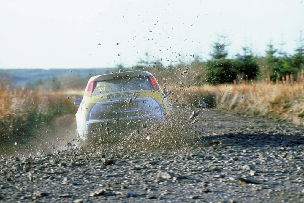 Alistair Ginley makes the mud fly in his Ford Focus. 2002 Network Q Rally.