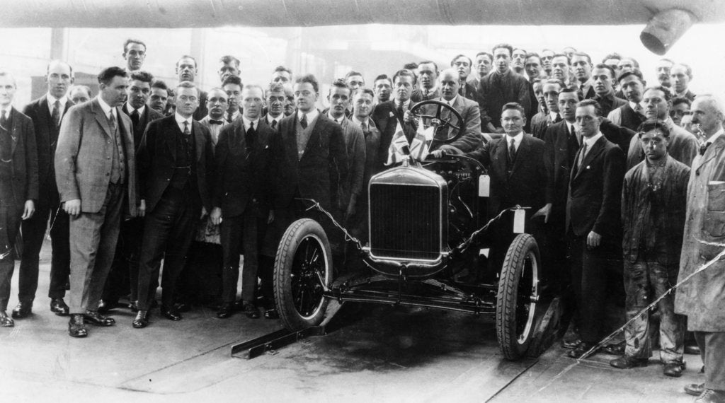 250,000th Model T Ford produced at Manchester, 1925. Management and workers pose with the car to commemorate this production milestone. The hugely successful Model T was Britain's best-selling car from 1913 to 1923. The factory began assembling cars from imported parts in 1911, but by 1924 the vehicles were being constructed from 94 % British parts. In 1931, Ford switched its manufacturing activities to its massive new plant at Dagenham, Essex.