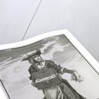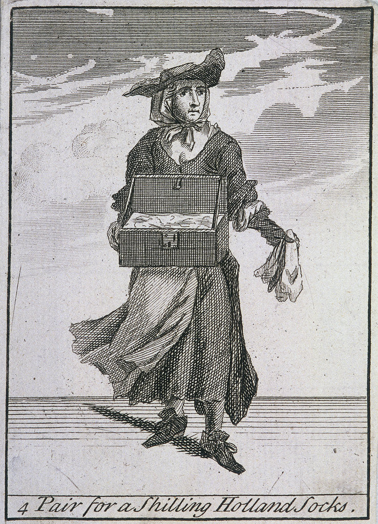 '4 Pair for a Shilling Holland Socks', (c1688?). A seller of socks made from holland linen with a wooden box of her wares; she holds out a handful of socks. From Cries of London, (c1688?).