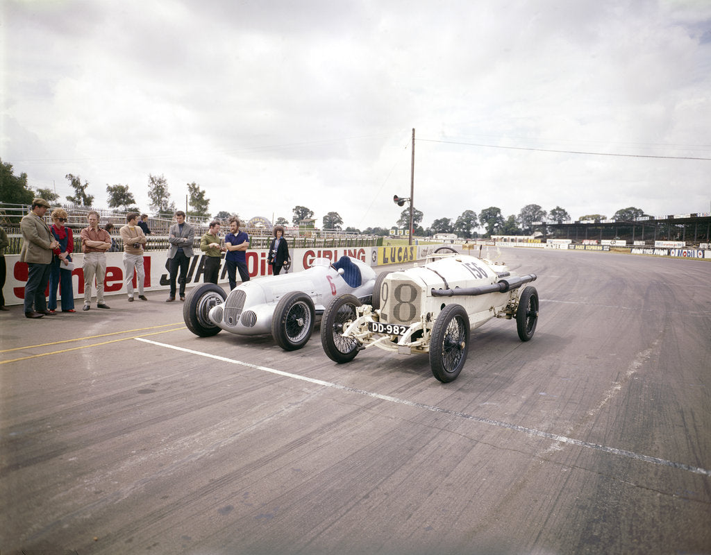 Product details A 1914 and 1937 Grand Prix Mercedes racing cars at the starting line