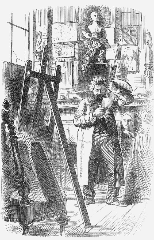 A bohemian artist in his studio, (1859?). A suitably bohemian artist stands in his attic with the tools of his craft all about. Authenticity is, of course, paramount, so his feelings on learning that the Bedouin outfit that he loaned a friend has been washed can only be imagined. From Punch, or the London Charivari, 1859.