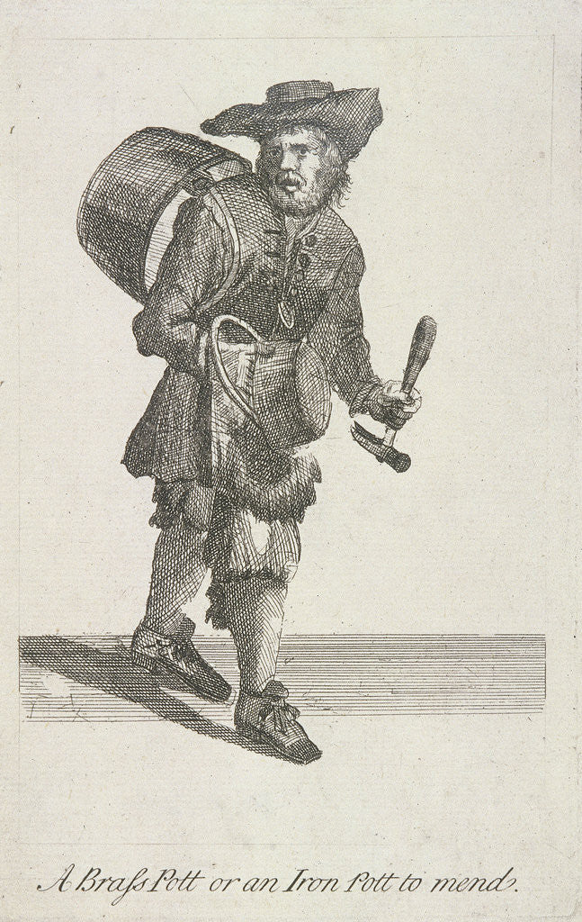 'A Brass Pott or an Iron Pott to mend'. A brass and iron pot mender, carrying a large pot or bucket over his shoulder. In his hands he is holding a smaller pot and a hammer. From Cries of London, c1688.