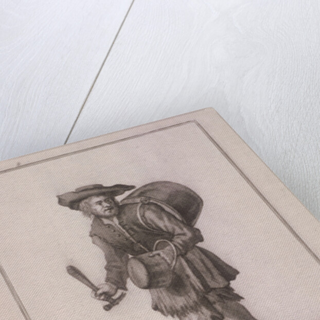 'A Brass Pott or an Iron Pott to mend'. A brass and iron pot mender, carrying a large pot or bucket over his shoulder. In his hands he is holding a smaller pot and a hammer. From Cries of London, (c1688?).
