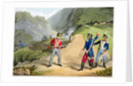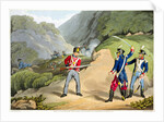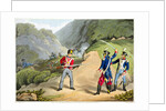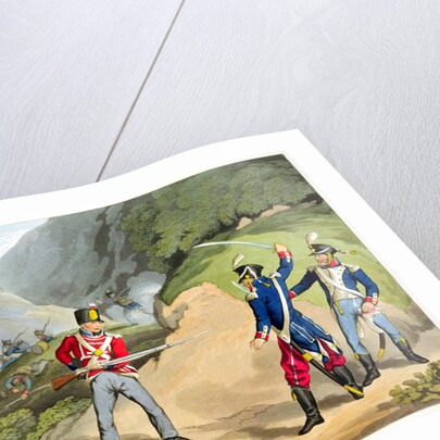 'A British Soldier Taking Two French Officers at the Battle of the Pyrenees', 1813 (1816). The battle saw the British under Wellington repel a French offensive to relieve the besieged garrisons of Pamplona and San Sebastian. From Historic, Military and Naval Anecdotes, published by Edward Orme, 1816.