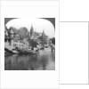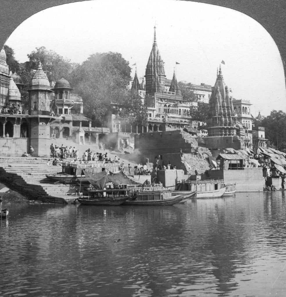 A burning ghat on the Ganges at Benares (Varanasi), India, 1900s. Stereoscopic slide. Detail.