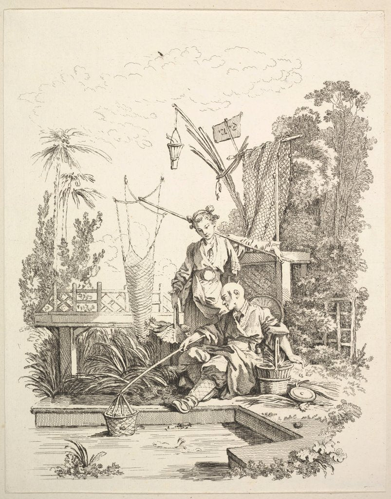 A Chinese Man and Woman Fishing by a Fishpond, 18th century. Scenes of Chinese Life. After Francois Boucher.