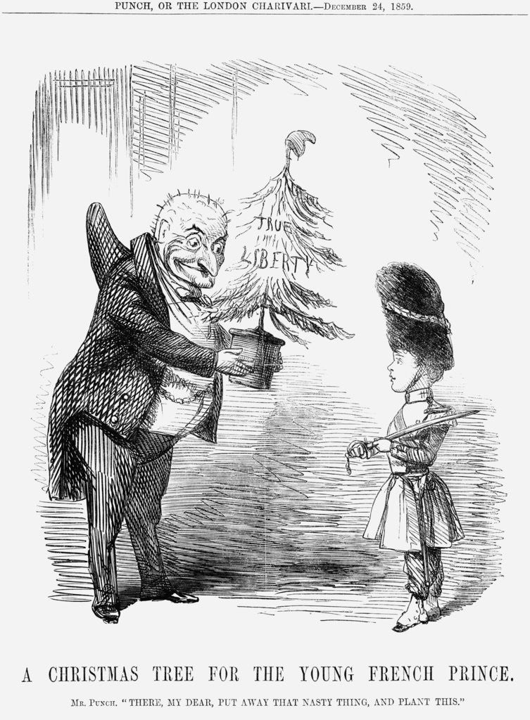 'A Christmas Tree for the young French Prince', 1859. 'Mr Punch There, my dear, put away that nasty thing, and plant this.' Mr Punch reflects the mood of the people when he expresses his fears about the aims of the Emperor Napoleon. However, in accordance with the spirit of the season, he presents the next generation of Frenchmen, represented here by Napoleon's young son, with the tree of True Liberty. Topped with the hat often shown in Punch to identify France, Mr Punch hopes that the spirit of Christmas will prevail. It is worth noticing, though, that the young Prince Imperial, is in military dress and is armed! From Punch, or the London Charivari, December 24, 1859.