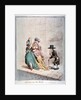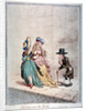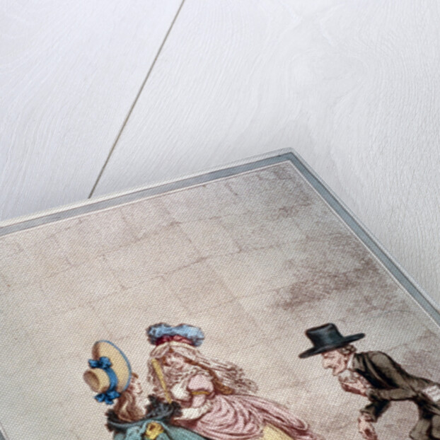 'A corner, near the Bank; - or - an example for fathers', 1797. Two young women on a street corner arm in arm, one flirting with a fan, the other raising her skirt to show her leg, turning to look at a diminutive man who follows them, leaning on his stick. From his pocket peeps a volume entitled Modest prints.