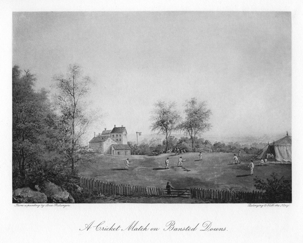 A cricket match on Bansted Downs, Surrey, 19th century (1912). From Imperial Cricket, edited by P F Warner and published by The London and Counties Press Association Ltd (London, 1912).