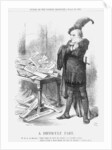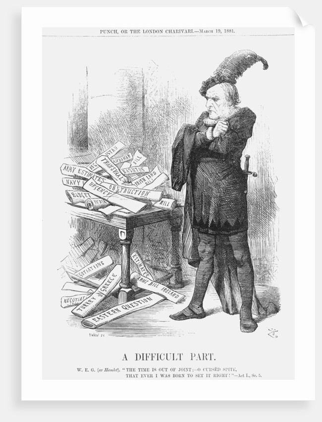 The Liberal Prime Minister, William Gladstone, is shown standing beside a table loaded with all the matters he must deal with during his term in office. Many of them relate to his predecessor's time in office. This cartoon was prompted by the Boer War which started under Disraeli's government. An armistice had been agreed recently, but in the House, Gladstone explained that although he, and many other Liberals, had opposed the annexation of the Transvaal, he could not see a way in which to reverse the action. He tried to reassure the House that the Government could fulfil its obligations as laid out in the Queen's Speech. This had stated the government's intention of pursuing military measures to reinforce the Royal authority, a statement which hardly accorded with the recently declared armistice. From Punch, or the London Charivari, March 19, 1881.