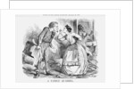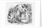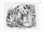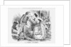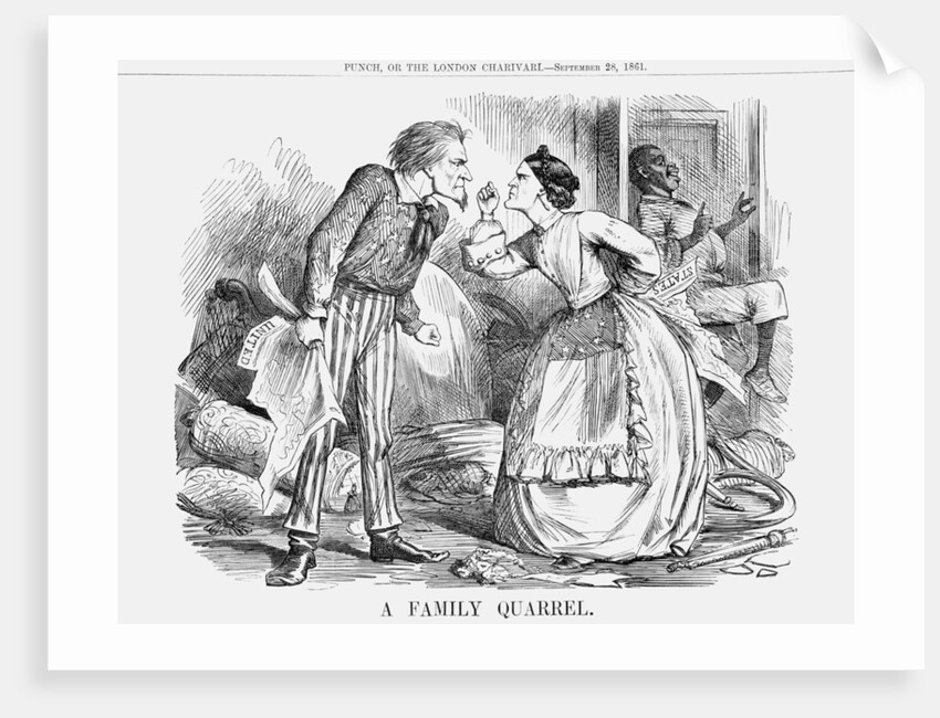 'A Family Quarrel', 1861. On the left is President Lincoln and, facing him is Mrs Carolina, representative of the Southern States. The setting is domestic and an argument has led to the map of the United States being torn into two, unequal, pieces. Whilst the two main characters argue, the family slave makes good his escape. From Punch, or the London Charivari, September 28, 1861.