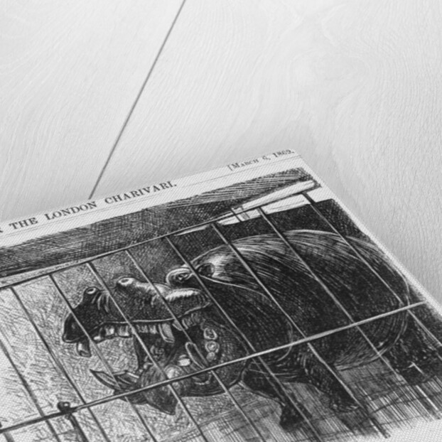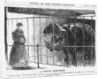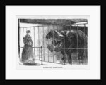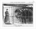 'A Gentle Vegetarian', 1869. A mighty hippopotamus displays its huge teeth. It is, however, as the hippo points out, the delicate lady on the other side of the cage who feasts on flesh, whereas the hippo feeds more daintily on rice. From Punch, or the London Charivari, March 6, 1869.