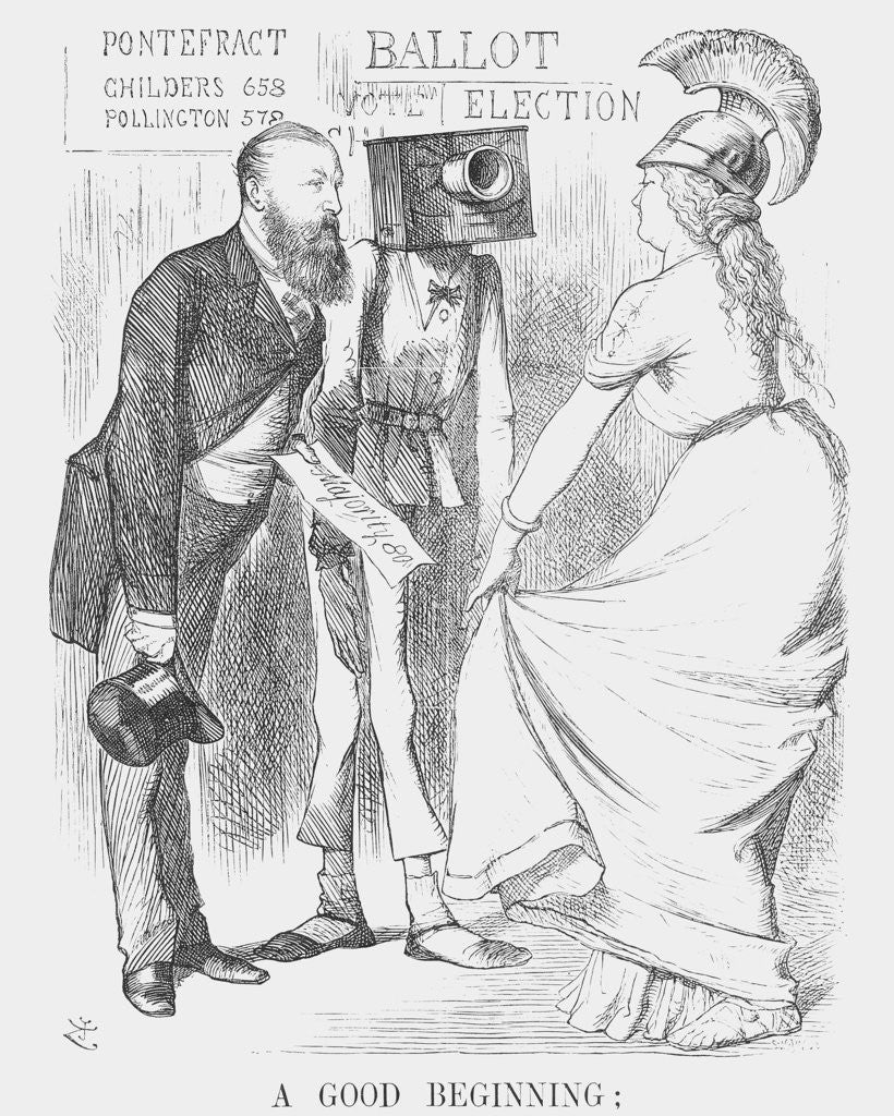 A Good Beginning.., 1872. The new Ballot Bill had recently been passed into law and here Britannia drops a slight curtsey to the lanky figure of the Ballot. The man to the left is Hugh Childers. This was the first parliamentary by-election held under the new regulations. Mr Childers was returned for the constituency of Pontefract by 658 votes. His Conservative opponent was Lord Pollington who won 578 votes. From Punch, or the London Charivari, August 24, 1872.
