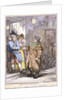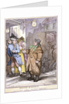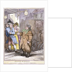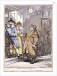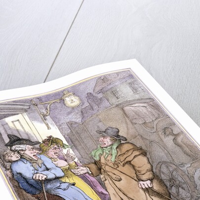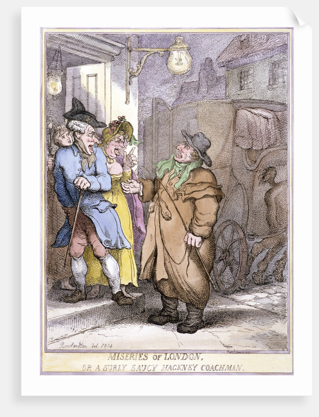 A hackney coachman, holding a coin in his hand, disputes the fare with two passengers in a doorway, London, 1814.