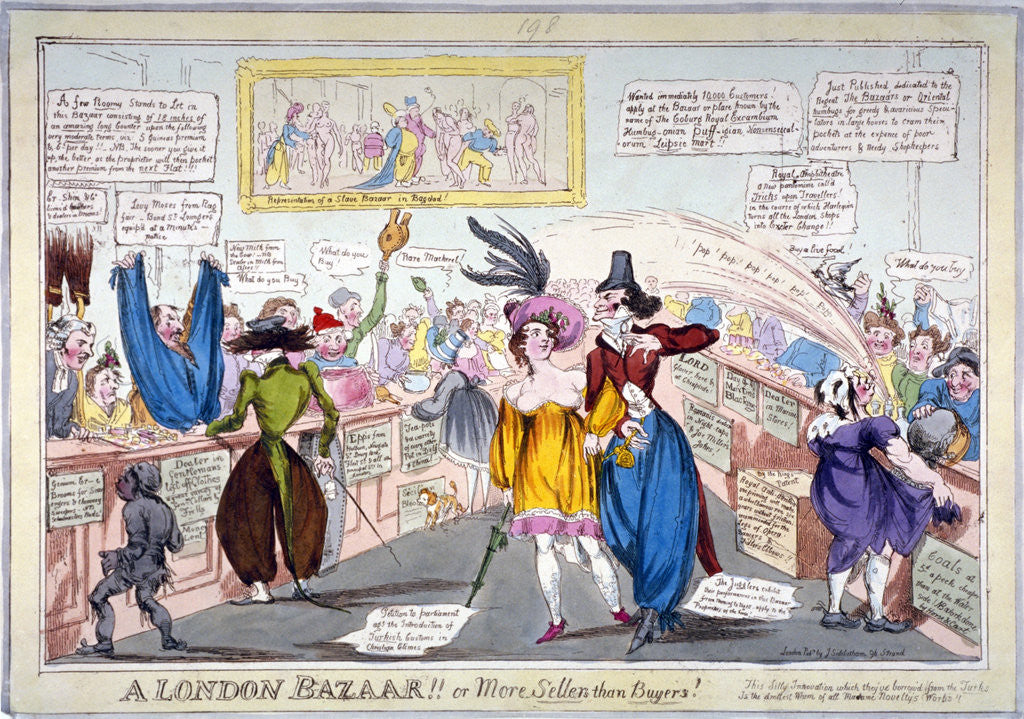 'A London Bazaar!! or more sellers than buyers!...', c1820. The scene is a bazaar or store in which all sorts of articles are offered for sale; on the wall hangs a representation of a slave bazaar in Bagdad. In the centre, a woman in exaggerated costume walks arm in arm with a man in Turkish pantaloons; a satire on the introduction to London of oriental methods of selling.