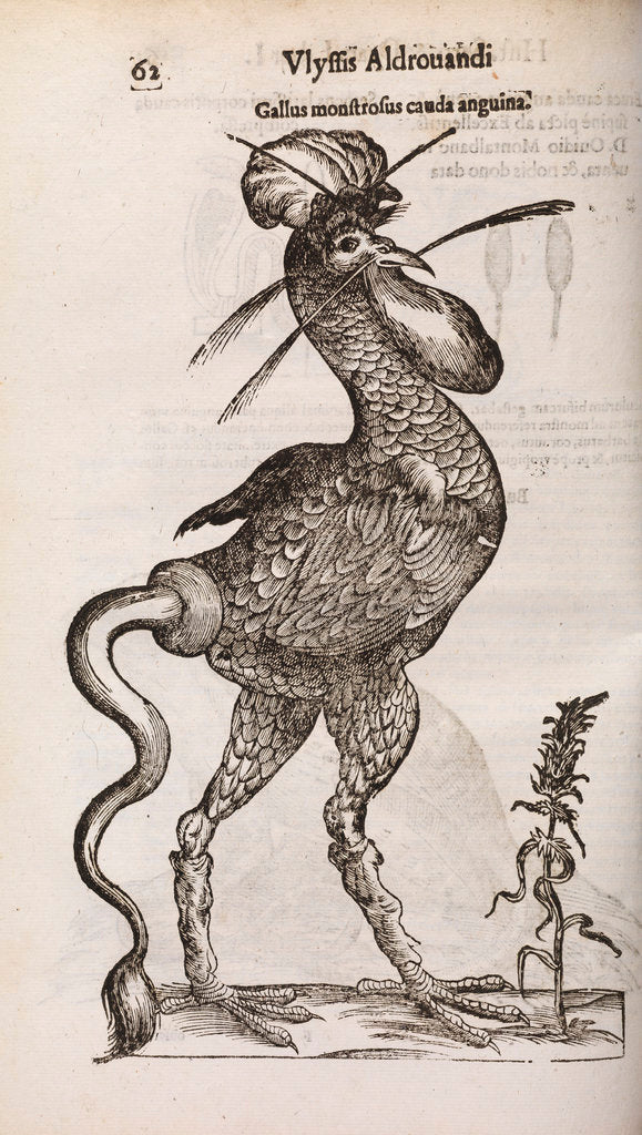 Plate showing the 'Gallus monstrosus cauda anguina' (monstrous cockerel with a snake's tail). From the book Serpentum et draconum historiae [Natural History of Snakes and Dragons] by Ulisse Aldrovandi (Bologna, 1640).