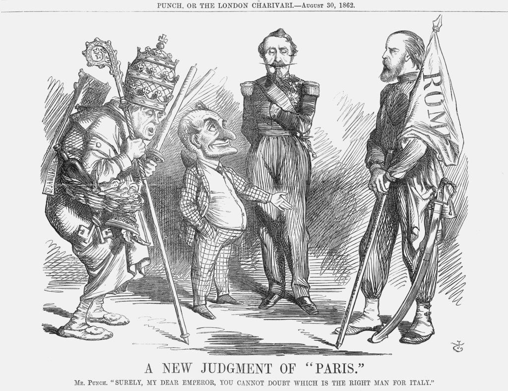 'A New Judgement of Paris', 1862. Mr. Punch says: Surely, My Dear Emperor, You Cannot Doubt Which is The Right Man for Italy. This cartoon refers to Garibaldi's plan to conquer Rome. He had come out of his retirement and had built a volunteer army in Sicily. Rattazzi, the Italian prime minister, decided that Garibaldi must be stopped. In August 1862, Garibaldi's army was defeated at Aspromonte. Garibaldi was injured but his English supporters sent over a top surgeon to extract the bullet from his leg. The Italians had been very disappointed by Napoleon's failure to honour his promise to free Italy. Napoleon had proposed to withdraw his soldiers from Rome, an announcement which considerably worried the Pope. Here, Mr Punch asks whether Napoleon had any real choice between the best man to lead Rome; the ineffectual and encumbered Pope Pius IX, shown here with all the heavy accoutrements of his office, or the lean and competent Garibaldi. From Punch, or the London Charivari, August 30, 1862.