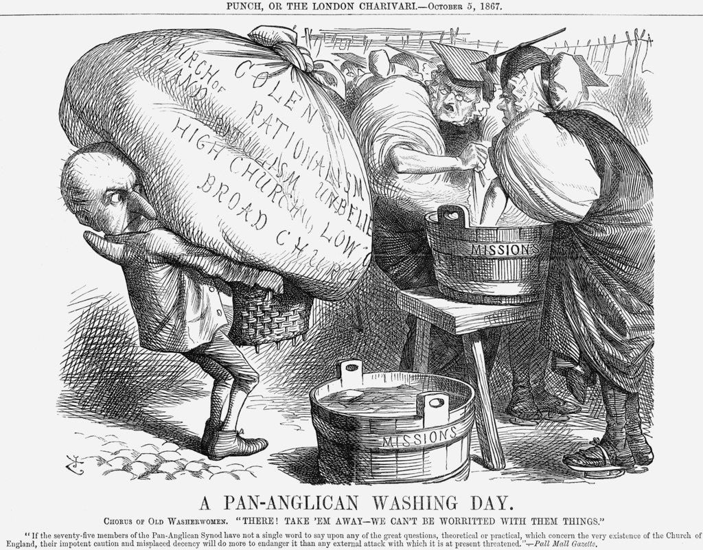 'A Pan-Anglican Washing Day', 1867. The reference to Colenso relates to Bishop Colenso of Natal whose work, The Pentateuch and Book of Joshua Critically Examined, had questioned, and rejected, the established belief that Moses had been the author of the Pentateuch. It was partly through works such as Colenso's, and publications such as those of the seven authors of Essays and Reviews, that the Pan-Anglican Synod had felt a need to meet to discuss the best way of promoting the reunion of Christendom and ancillary matters to do with Church discipline and promotion of the Church's message. From Punch, or the London Charivari, October 5, 1867.