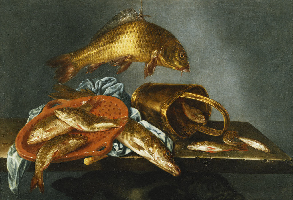 Product details A Pike, Carp, Tench and Roach with a Sieve and a Brass Bucket on a Ledge