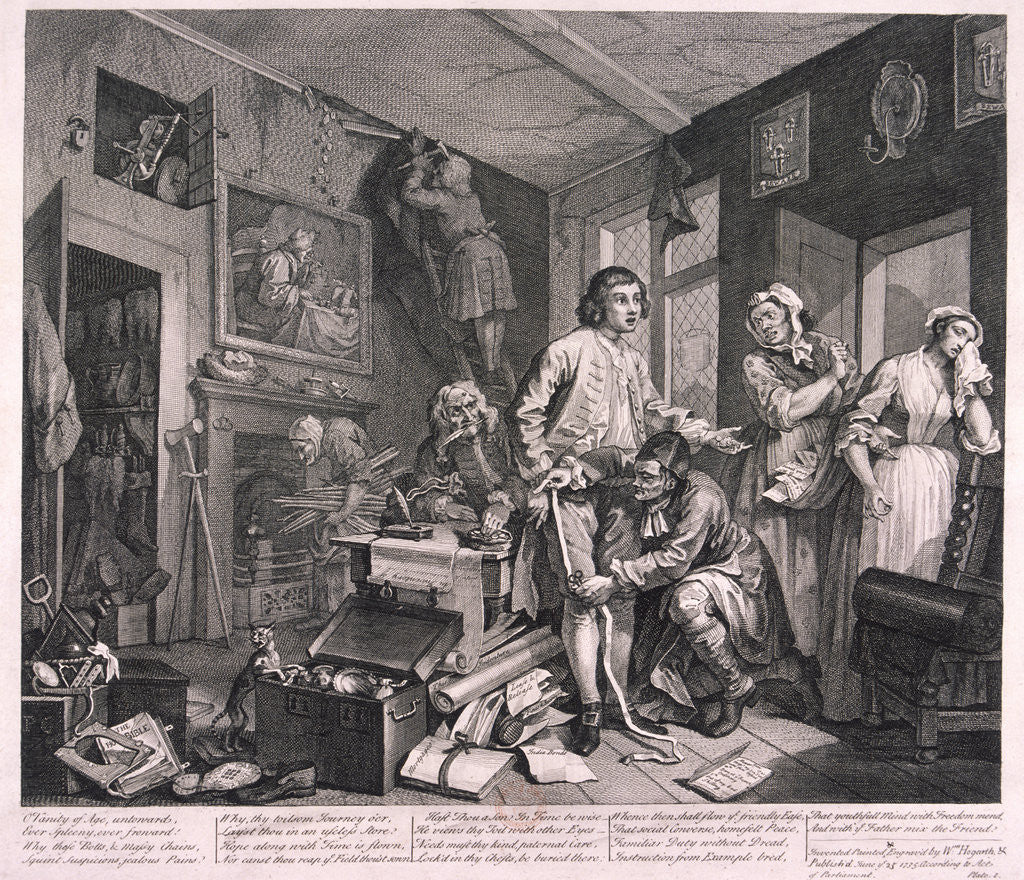'A Rake's Progress', 1735; plate I of VIII. Tom Rakewell is taking possession of his miserly father's effects. Kneeling beside him is a tailor measuring him up for a new set of clothes, whilst the rake tries to buy off Sarah Young, who stands by the door crying and holding a wedding ring, with her angry mother next to her.
