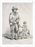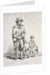 A rustic, wearing a hat and long coat, accompanied by a small boy and a dog, from Provincial Characters, 1813.