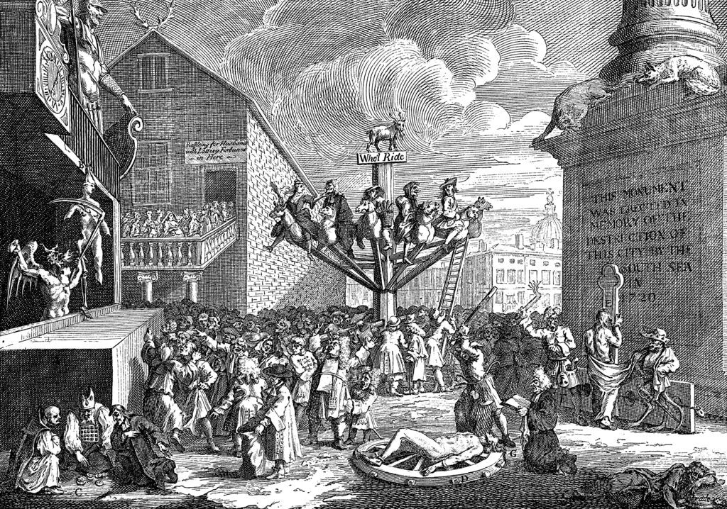 'A Satire on the South Sea Company', 1721. The South Sea Bubble (1711-1720), showing greed and speculation which preceded the bubble. 'Get rich quick' speculators are shown on the merry go round, while on the ground Honour and Honesty are flogged by Self Interest and Villainy. Illustration from Social Caricature in the Eighteenth Century ... With over two hundred illustrations by George Paston [pseudonym of Emily Morse Symonds], (London, 1905).