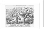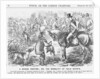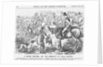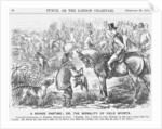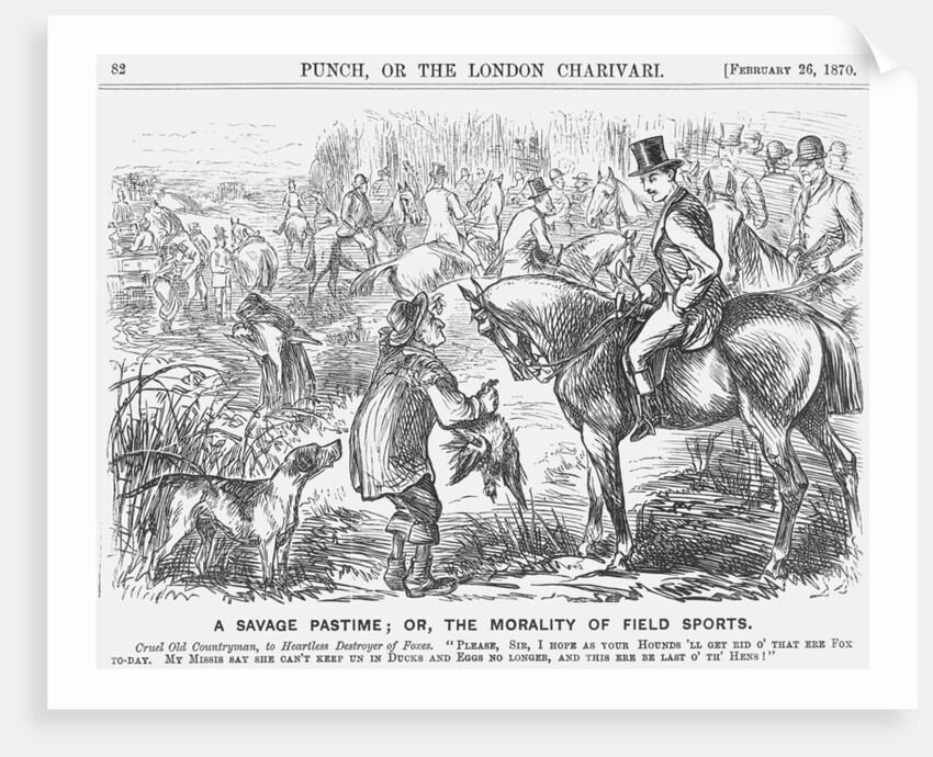 'A Savage Pastime; or, the Morality of Field Sports', 1870. The rural labourer doffs his hat to the upper class rider who is preparing to set off with the Hunt. A beagle stands to attention in anticipation of the chase. This cartoon illustrates the beginning of pressure by groups opposed to blood-sports, and shows how the moral aims of such groups may not entirely accord with the needs of rural communities. From Punch, or the London Charivari, February 26, 1870.