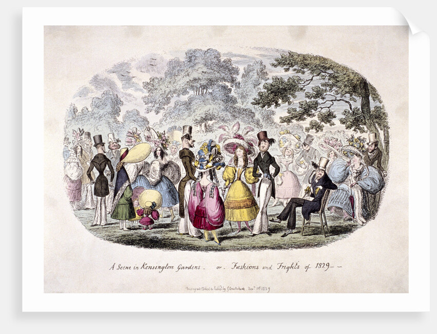 'A scene in Kensington Gardens - or - fashion and frights of 1829; showing a fashion-promenade in Kensington Gardens, London; women wearing huge over-trimmed hats and and men with their hair shaved at the back but bunched and projecting under one side of their hats.