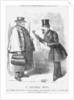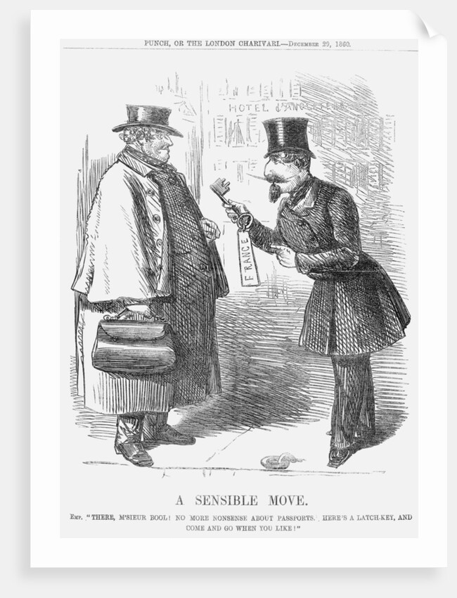 ' A Sensible Move'. 1860. Napoleon III giving John Bull, the representative of the British people, the key to the door of France, remarking There, M'sieur Bool! No more nonsense about Passports. Here's a Latch-key, and come and go when you like! From 1st January 1861, Napoleon III decided that the subjects of the queen of Great Britain and Ireland would be free to enter France without passports. From Punch, or the London Charivari, December 29, 1860.