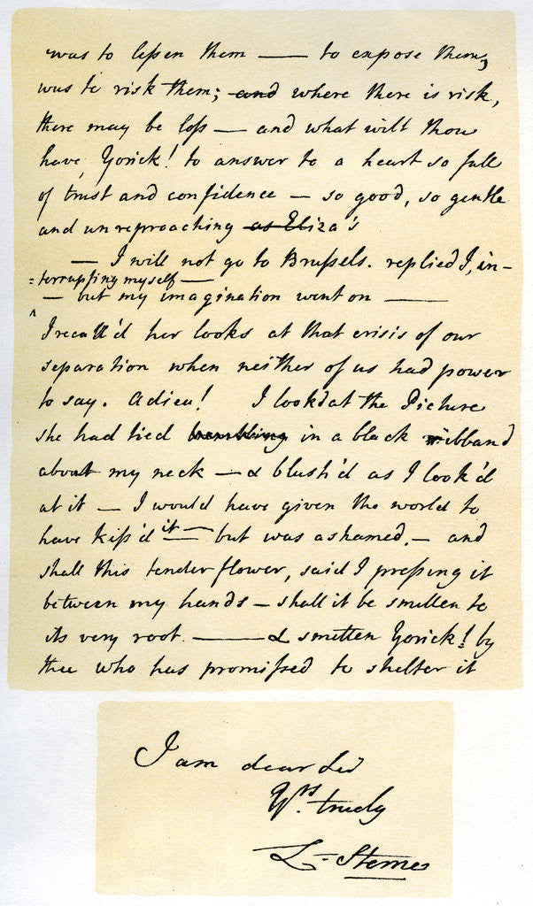 A Sentimental Journey through France and Italy, 1767. The original manuscript, with corrections, of the first part (vol i) of A Sentimental Journey through France and Italy, written by Lawrence Sterne in 1767 and published in 1768. The page reproduced contains the mention of 'Eliza' and her picture. The detached signature is from a letter to T Becket, bookseller, dated 15th July 1763, relative to the sale of vols v and vi of Tristram Shandy. From the fourth series of Facsimiles of royal, historical, literary and other autographs in the Department of Manuscripts, British Museum: Series I - V, (London, 1899).